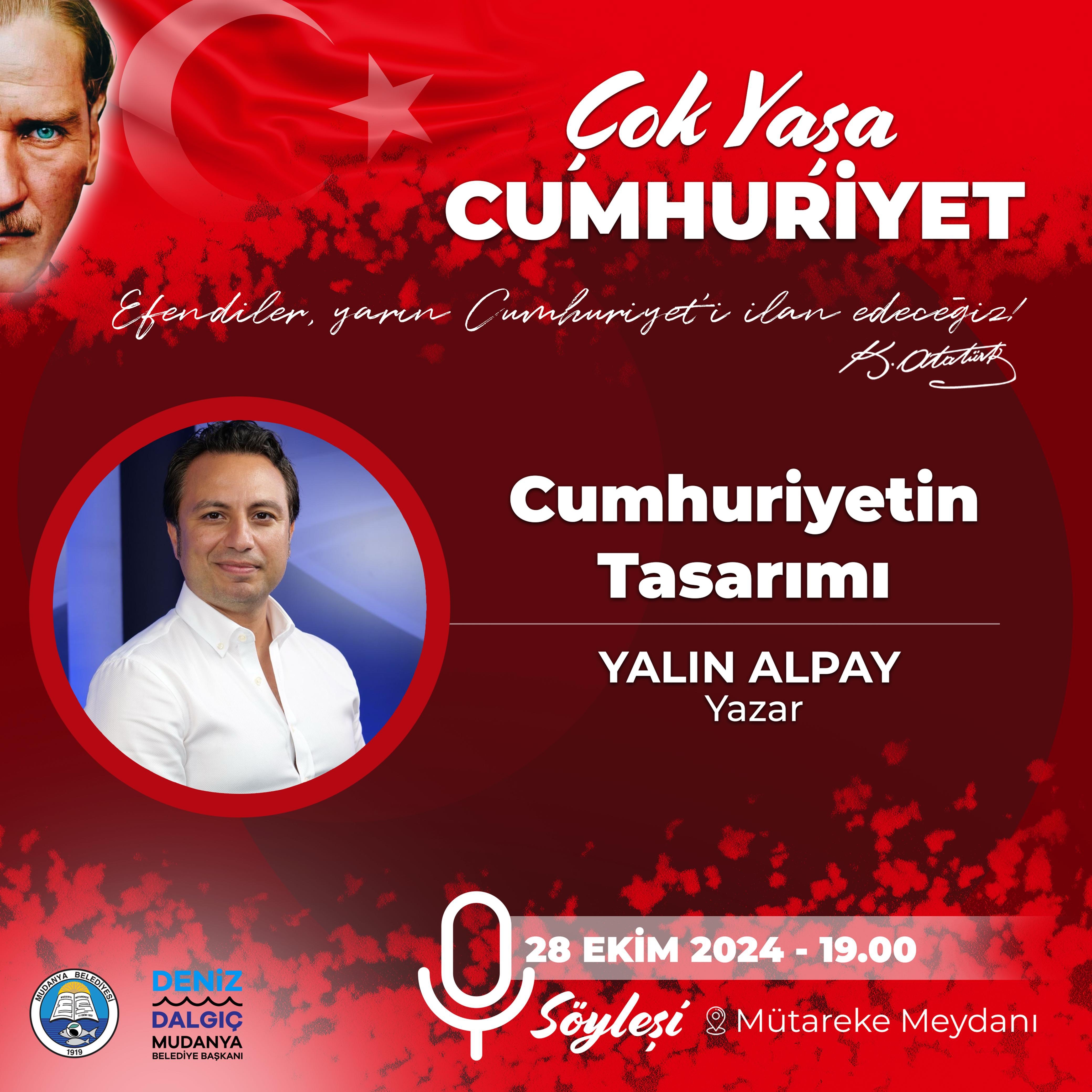 Türkiye Cumhuriyeti’nin kuruluş temellerinin atıldığı anlaşmaya ev sahipliği yapan Mudanya’da, 29 Ekim Cumhuriyet Bayramı coşkuyla kutlanacak. Kutlamalar, 28 Ekim saat 13.00’te Atatürk Anıtı’na çelenk sunma töreniyle başlayacak. Aynı gün Mudanya Belediyesi tarafından düzenlenen spor etkinliklerinde genç kızlar ve genç erkekler kategorilerinde Cumhuriyet Koşusu, 3x3 Sokak Basketbolu ve bisiklet turu yapılacak. 28 Ekim akşamı Mütareke Meydanı’nda yazar Yalın Alpay, “Cumhuriyetin Tasarımı” başlıklı söyleşiyle Mudanyalılarla buluşacak.