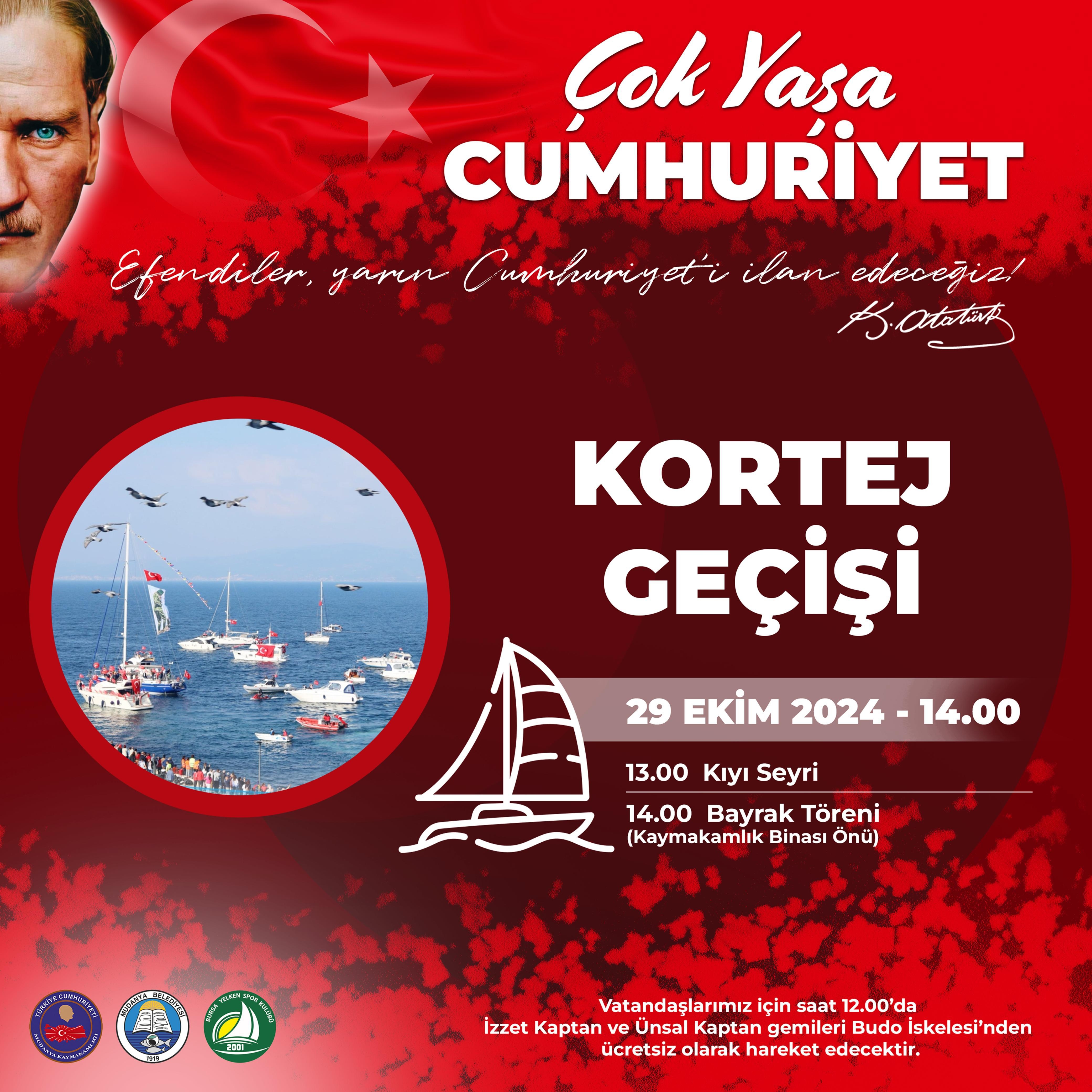 29 Ekim Salı günü saat 10.00’da Mudanya İlçe Spor Salonu’nda yapılacak resmi kutlama programının ardından, İskele Meydanı’na kadar protokol ve öğrencilerin katılımıyla Cumhuriyet yürüyüşü gerçekleştirilecek. Yürüyüşün ardından saat 13.00’te tekneler Mudanya’nın mavi sularında buluşacak, kortej geçişi ve bayrak töreni düzenlenecek.